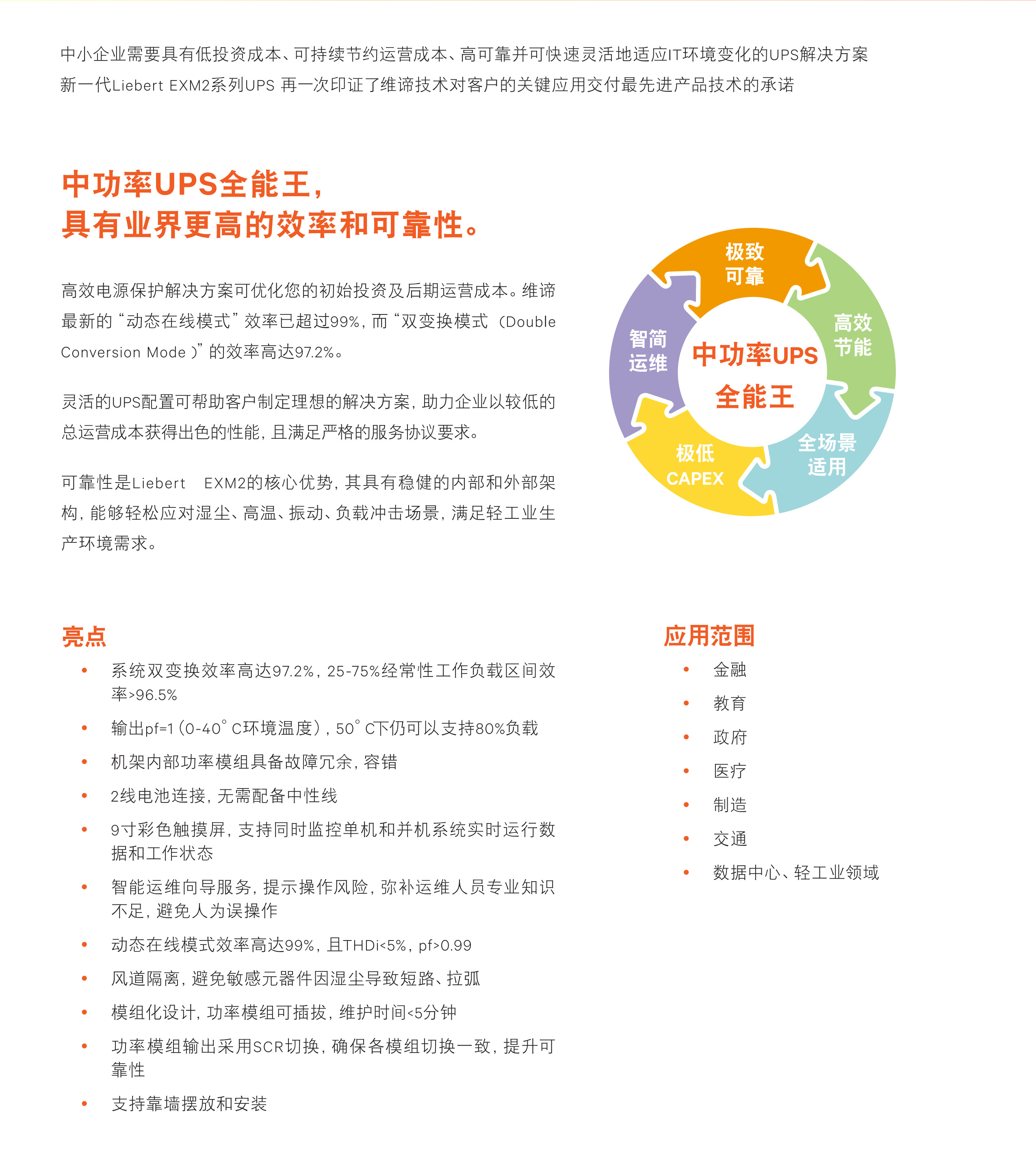 中小企业需要具有低投资成本、可持续节约运营成本、高可靠并可快速灵活地适应IT环境变化的UPS解决方案新一代Liebert EXM2系列UPS 再一次印证了维谛技术对客户的关键应用交付最先进产品技术的承诺