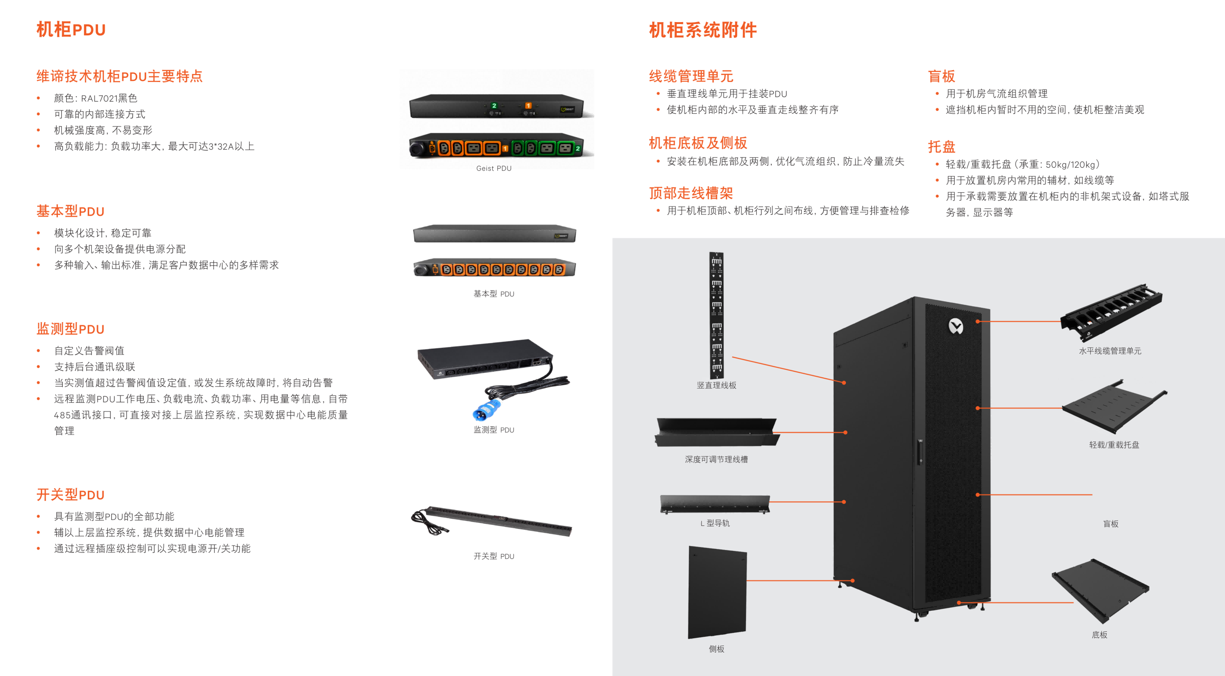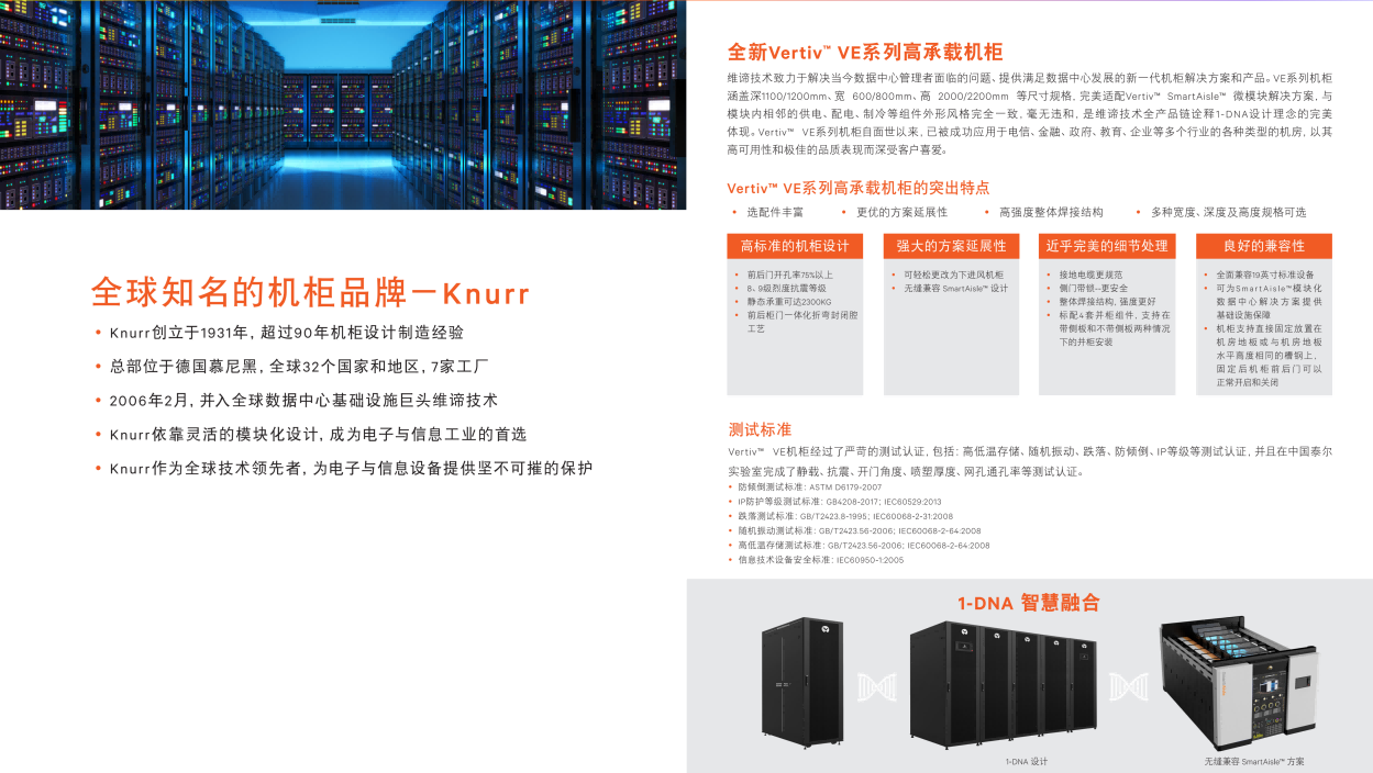 致力于解决当今数据中心管理者面临的问题、提供满足数据中心发展的新一代机柜解决方案和产品。VE系列机柜 涵盖深1100/1200mm、宽 600/800mm、高 2000/2200mm 等尺寸规格,完美适配Vertiv™ SmartAisle™ 微模块解决方案,与 模块内相邻的供电、配电、制冷等组件外形风格完全一致,毫无违和,是维谛技术全产品链诠释1-DNA设计理念的完美 体现。Vertiv™ VE系列机柜自面世以来,已被成功应用于电信、金融、政府、教育、企业等多个行业的各种类型的机房,以其 高可用性和极佳的品质表现而深受客户喜爱。