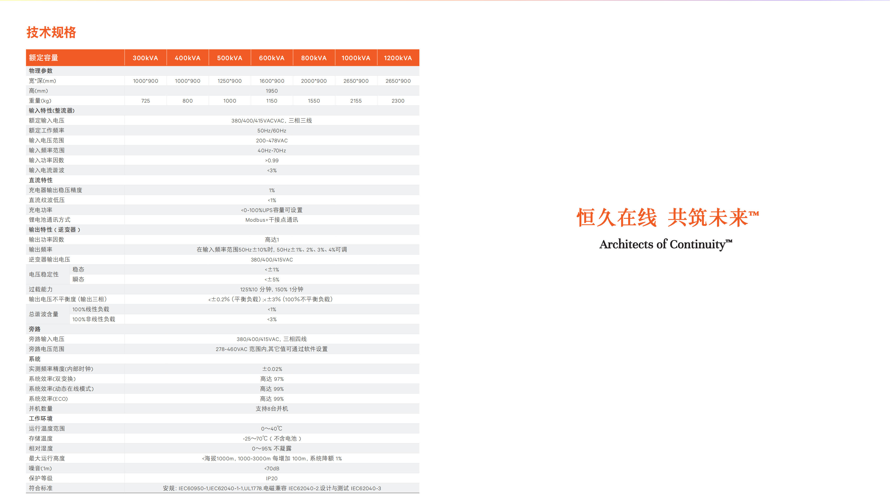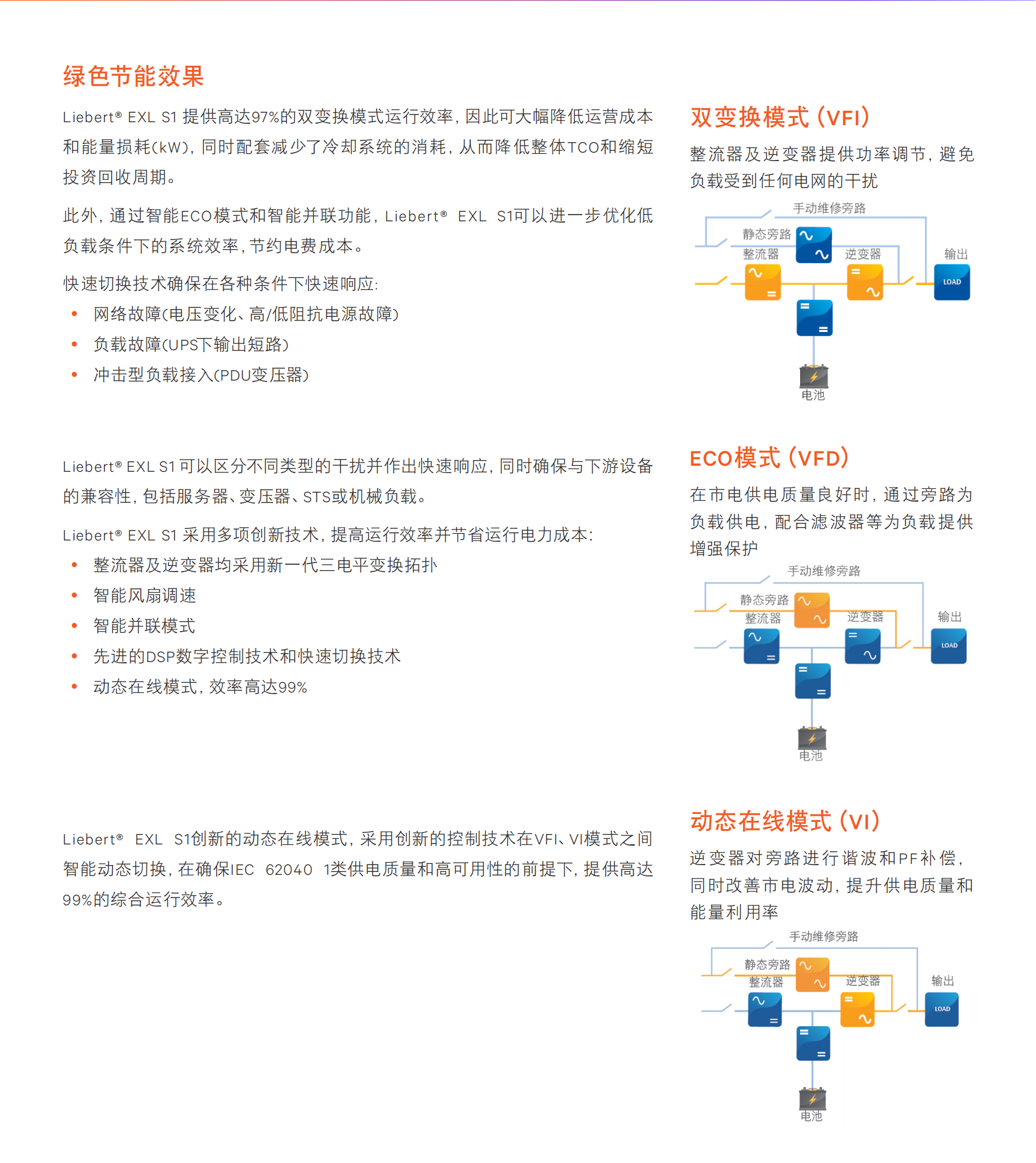 作为新一代大功率UPS,Liebert® EXL S1可为中大型数据中心和储能系统提供持续运行的良好性能表现, 而这一切都源自久经考验的运行经验、全球成功案例、可靠的大量安装基数和40年以上的研发和运维的经验。 Liebert® EXL S1为高频一体化大功率UPS,创新架构设计,在实现更高的系统可靠性的同时,提升节能效果与提高维护 便捷性。新一代IGBT三电平拓扑结构提升节能效果,双变换效率高达97%,动态在线模式效率高达99%。 创新直流变换及控制技术,配套锂电池,结合电网峰平谷时段实现削峰填谷套利;兼容新能源的转化与应用,降费节碳, 显著节约运行成本并降低TCO。 此外,其更高的功率密度和更小的空间占用可优化空间利用率并降低相关成本。 Liebert® EXL S1的功率范围从300到1200kVA,它提供可靠的供电质量,为关键业务持续运行提供高等级的负载保护。