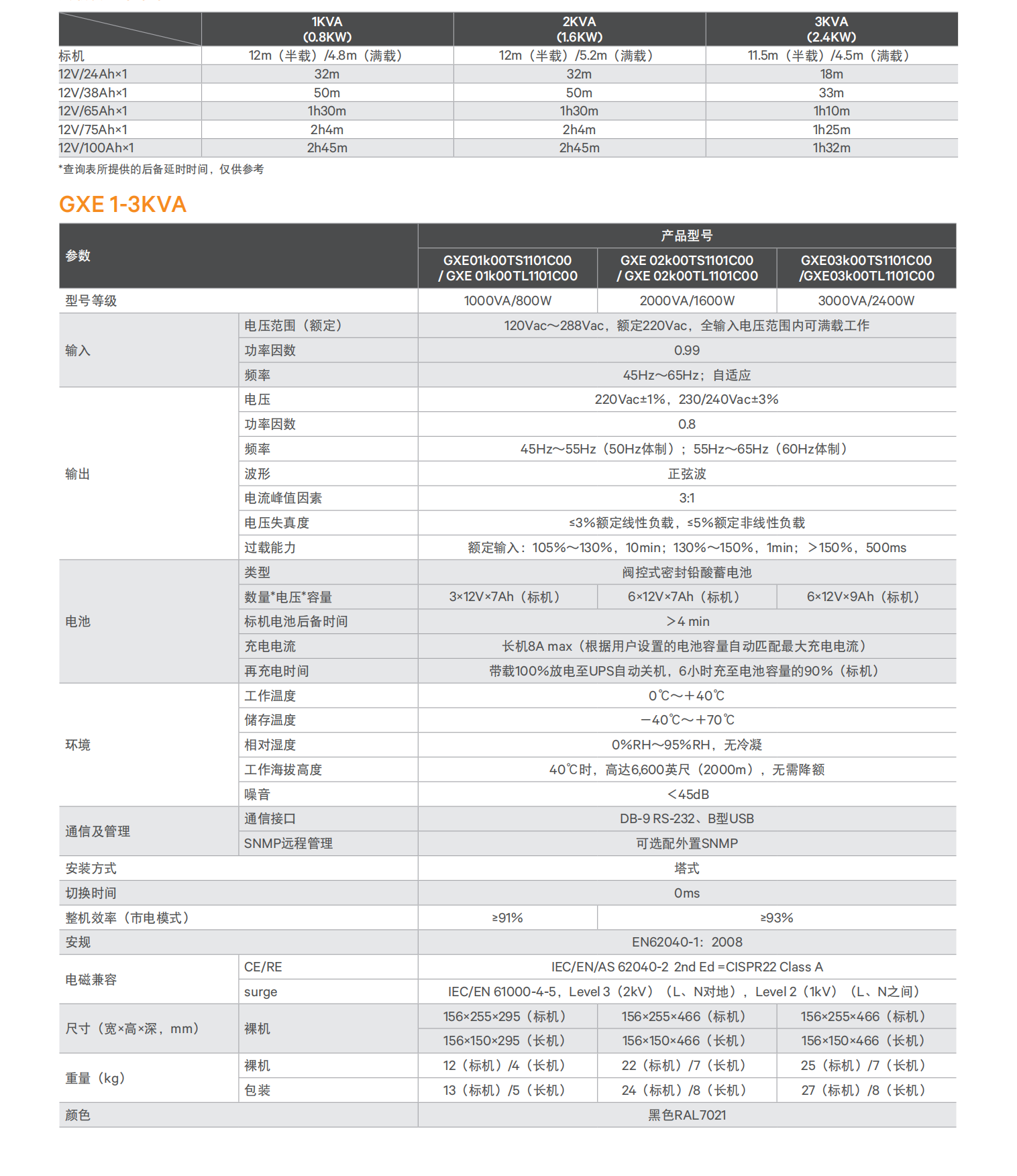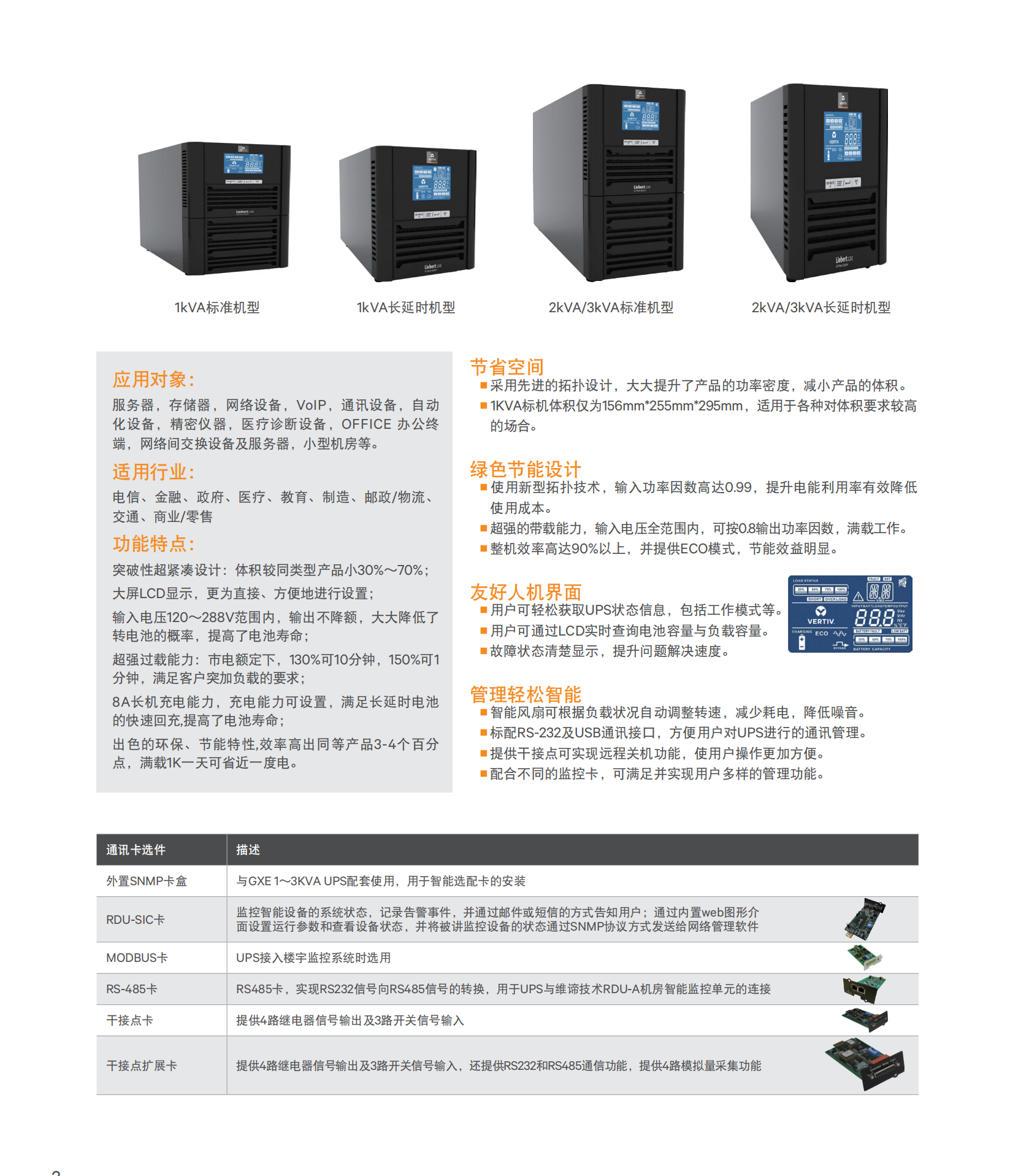 突破性超紧凑设计:体积较同类型产品小30%~70%; 大屏LCD显示,更为直接、方便地进行设置; 输入电压120~288V范围内,输出不降额,大大降低了 转电池的概率,提高了电池寿命; 超强过载能力:市电额定下,130%可10分钟,150%可1 分钟,满足客户突加负载的要求; 8A长机充电能力,充电能力可设置,满足长延时电池 的快速回充,提高了电池寿命; 出色的环保、节能特性,效率高出同等产品3-4个百分 点,满载1K一天可省近一度电。