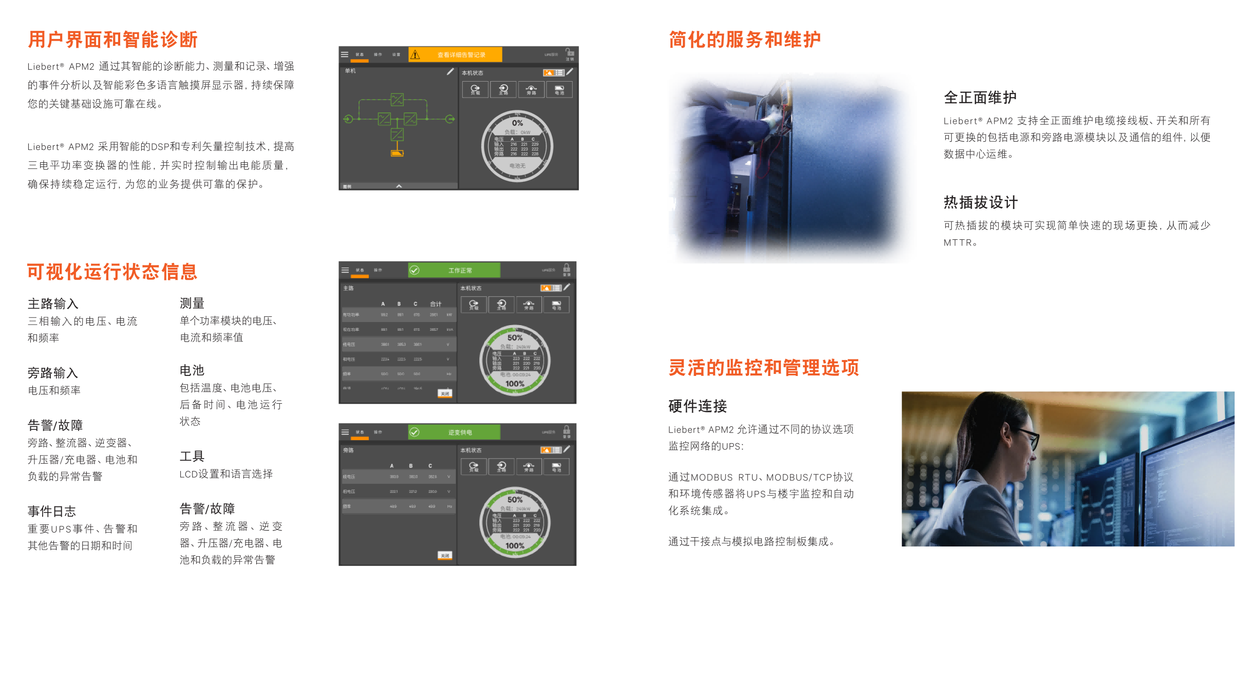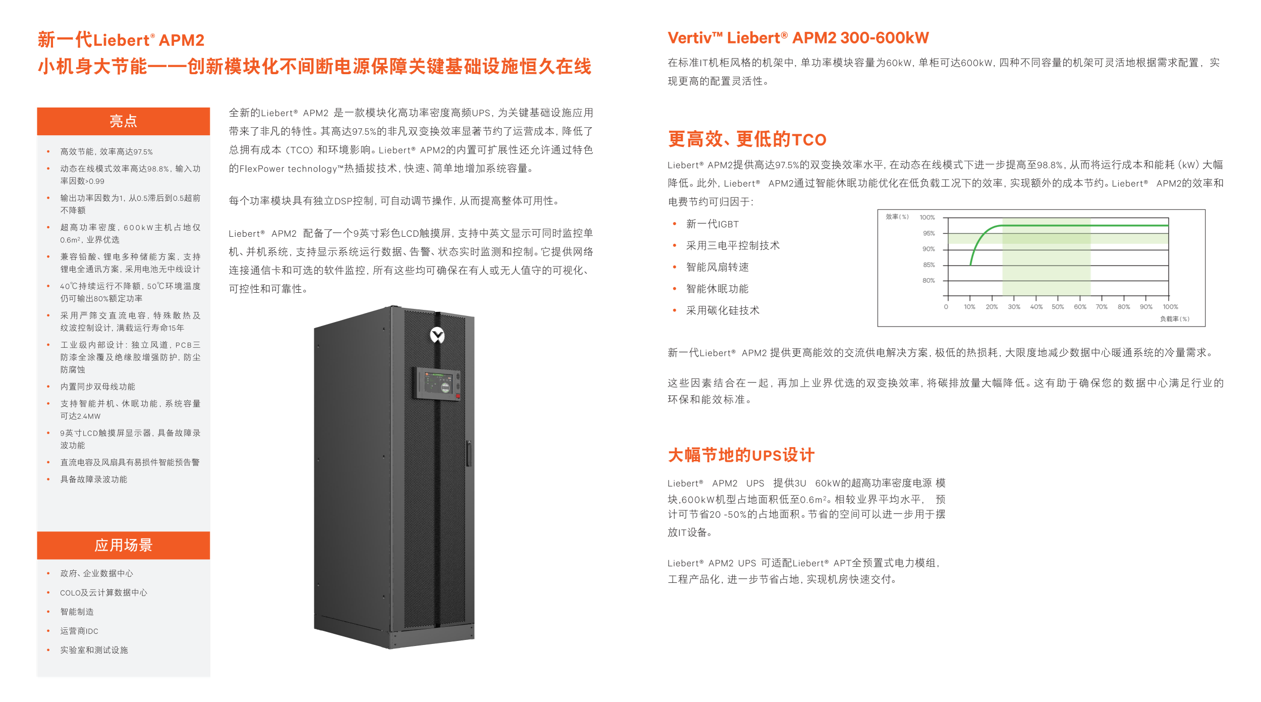 全新的Liebert® APM2 是一款模块化高功率密度高频UPS,为关键基础设施应用带来了非凡的特性。其高达97.5%的非凡双变换效率显著节约了运营成本,降低了总拥有成本 (TCO) 和环境影响。Liebert® APM2的内置可扩展性还允许通过特色的FlexPower technology™热插拔技术,快速、简单地增加系统容量。